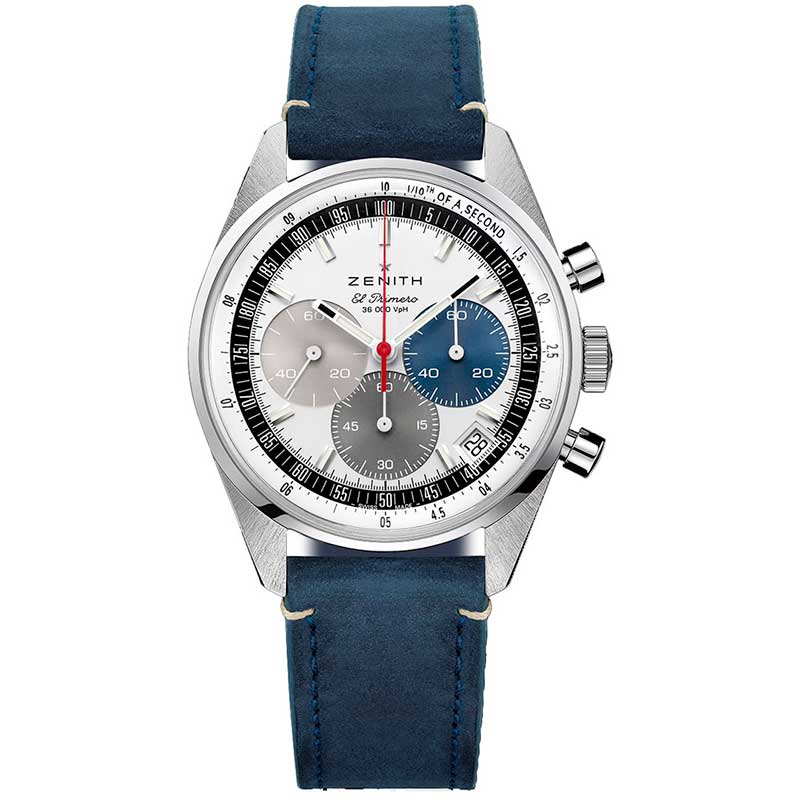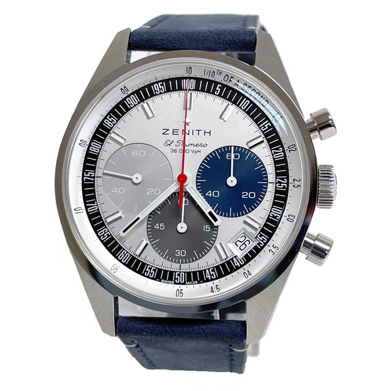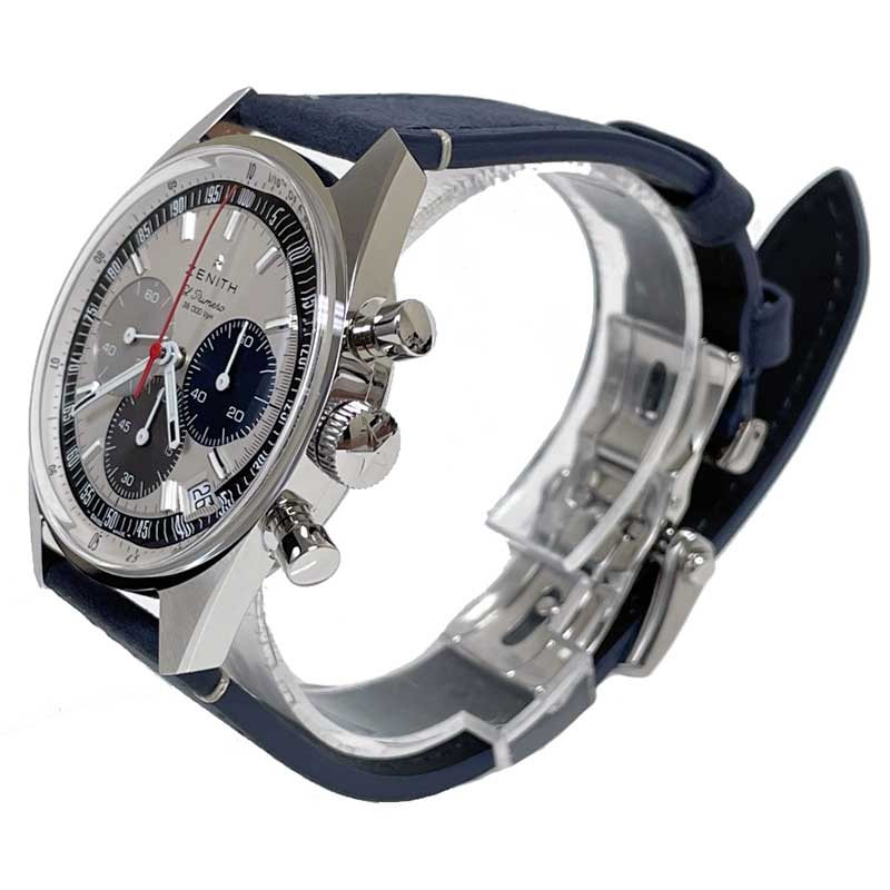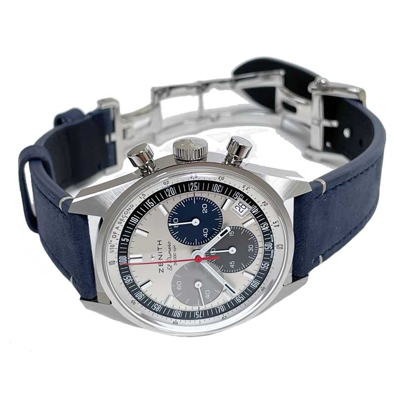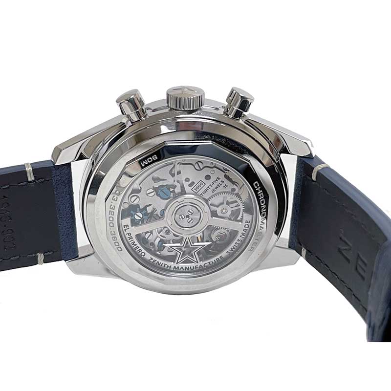 Zenith Chronomaster Mens Watch 03.3200.3600/69.C902. Stainless steel case with a blue leather bracelet. Zenith in-house caliber El Primero 3600, beats at 36,000 vph (5Hz), contains 35 jewels & has an approximate power reserve of 60 hours.
