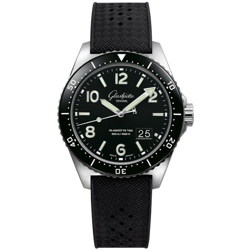Glashutte Original 1-36-13-01-80-33 SeaQ Panorama Date 43.2mm Mens Watch. The watch features a brushed and polished stainless steel case, complemented by a black galvanic dial with a sunray finish. The polished hands and applied hour markers are filled with luminous material for easy readability in low light. A fine printed minute/seconds track runs along the outer edge of the dial, while a panorama date window is located at 4 o'clock. Powered by the Glashutte Original caliber 36-13, this timepiece beats at 28,800 vph, contains 41 jewels, and boasts an impressive power reserve of approximately 100 hours.