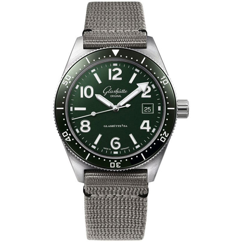 Glashutte Original 1-39-11-13-83-08 SeaQ Automatic 39.5mm Mens Watch. The watch features a brushed and polished stainless steel case, complemented by a green ceramic bezel with a minute scale. The reed green dial showcases polished hands with luminous fill and applied hour markers, also with luminous fill. A fine printed minute/seconds track enhances the face of the timepiece, with a date window conveniently located at 3 o'clock. Powering this watch is the Glashutte Original caliber 39-11, operating at 28,800 vibrations per hour, housing 25 jewels, and boasting an approximate power reserve of 40 hours.