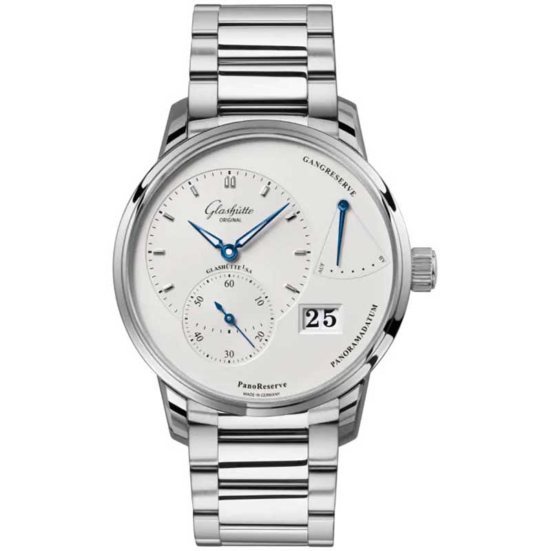 Glashutte 1-65-01-22-12-71 40mm stainless steel case, 11.70 mm thick, sapphire crystal back, galvanized silver opalin dial with indices applied, printed scales, black panorama date on ivory coloured background, Calibre 65-01 manual winding movement with hour and minute, small second, panorama date, power reserve display, power reserve, stainless steel bracelet, folding buckle.