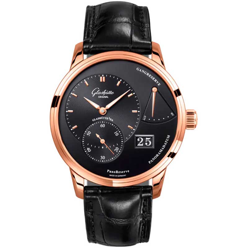 Glashutte 1-65-01-29-15-61 40mm 18kt rose gold case, 11.70 mm thick, sapphire crystal back, galvanized blue dial with indices applied, printed scales, white panorama date on black background, Calibre 65-01 manual winding movement with hour and minute, small second, panorama date, power reserve display, power reserve, black louisiana alligator leather strap, folding buckle.