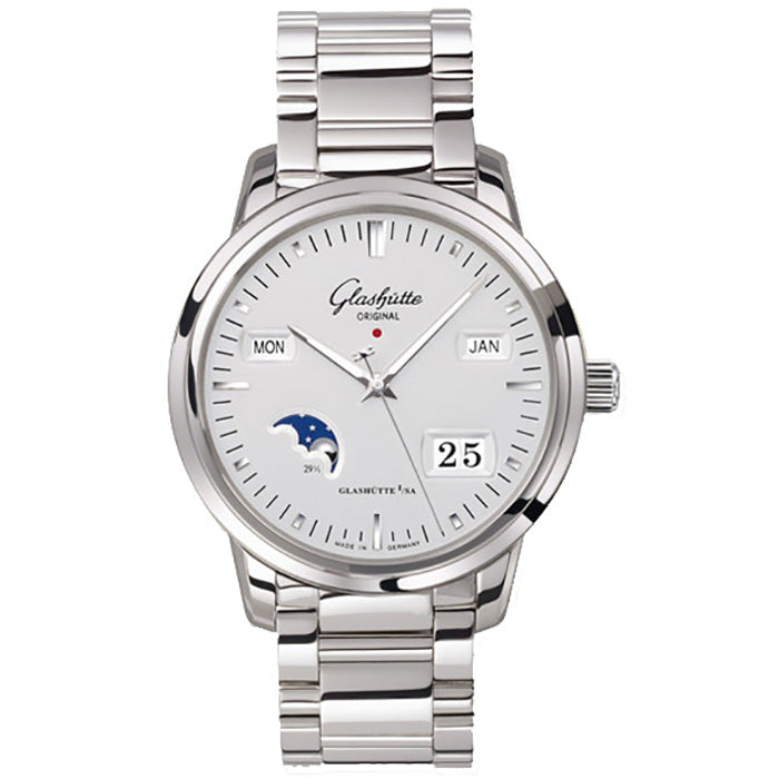 Glashutte Original 100-02-13-02-14 Senator Perpetual Calendar Mens Watch. Silver dial with Silver toned & Luminous hands. Applied Silver toned Index hour markers. Features a Perpetual Calendar complication that accurately calculates odd & even month & leap years without the need to correct the date.