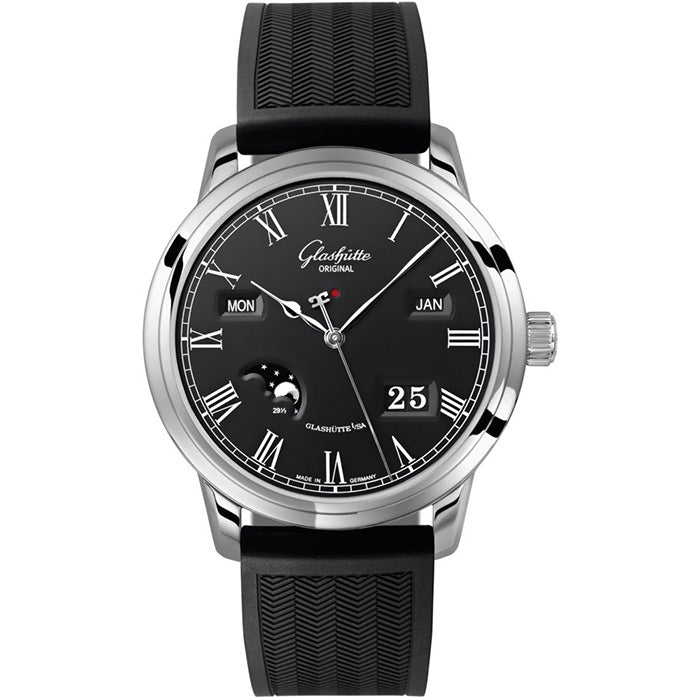 Glashutte Senator Black Dial Automatic Mens Watch 100-02-25-12-04. Stainless steel case with a black rubber strap. Fixed bezel. Black dial with white gold hands and Roman numeral hour markers. Calibre 100-02 automatic movement. Scratch resistant sapphire crystal. Case size: 42 mm. Case thickness: 13.6 mm. Round case shape. Water resistant at 50 meters / 165 feet. Functions: date, hour, minute, second, perpetual calendar. Luxury watch style. Watch label: Made In Germany.