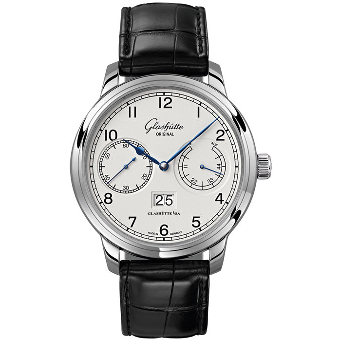 Glashutte Original 100-14-05-02-04 Senator Observer Mens Watch. Stainless steel case: Polished finished top & bottom, fine brushed finished edges. Painted black Arabic Numeral hour markers & minute track. Polished blued steel hands. Large 2-disc Date display window located above the 6 o'clock position. Power reserve indicator sub-dial located at the 3 o'clock position. Continuous running small seconds hand sub-dial located at the 9 o'clock position. Movement is finely finished with striped/ribbed finish, some hand engraved designs & beveled component edges.