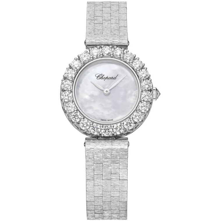Chopard 10A178-1101 L'Heure Du Diamant Cushion Ladies Watch. The 18kt white gold case features bezel & lugs adorned with 22 prong-set brilliant cut diamonds totaling approximately 2.20 carats, while the crown is embellished with a stunning briolette diamond weighing around 0.03 carats. The dial showcases a natural mother of pearl design complemented by polished hands, all powered by a manual winding movement boasting a power reserve of about 30 hours.