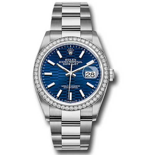 Rolex 126284RBR blflmio Stainless Steel & White Gold 36mm Men's Watch. 36mm Oystersteel case, screw-down steel back, screw-down crown with twinlock double waterproofness system, diamond bezel, scratch-resistant sapphire crystal with cyclops lens over the date, blue fluted motif dial, index hour markers, Rolex calibre 3235 perpetual self-winding movement with center hour, minute and seconds hands, instantaneous date at 3 o'clock with rapid setting, and stop-seconds for precise time setting, approximately 70 hours of power reserve, Oyster bracelet with flat three-piece links, folding Oysterclasp buckle with Easylink 5mm comfort extension link. Waterproof to 100 meters. Baselworld 2019 release.