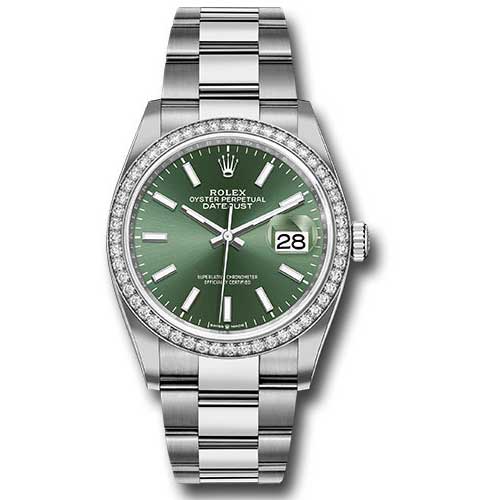 Rolex 126284RBR mgio Stainless Steel & White Gold 36mm Men's Watch. 36mm Oystersteel case, screw-down steel back, screw-down crown with twinlock double waterproofness system, diamond bezel, scratch-resistant sapphire crystal with cyclops lens over the date, mint green dial, Index hour markers, Rolex calibre 3235 perpetual self-winding movement with center hour, minute and seconds hands, instantaneous date at 3 o'clock with rapid setting, and stop-seconds for precise time setting, approximately 70 hours of power reserve, Oyster bracelet with flat three-piece links, folding Oysterclasp buckle with Easylink.