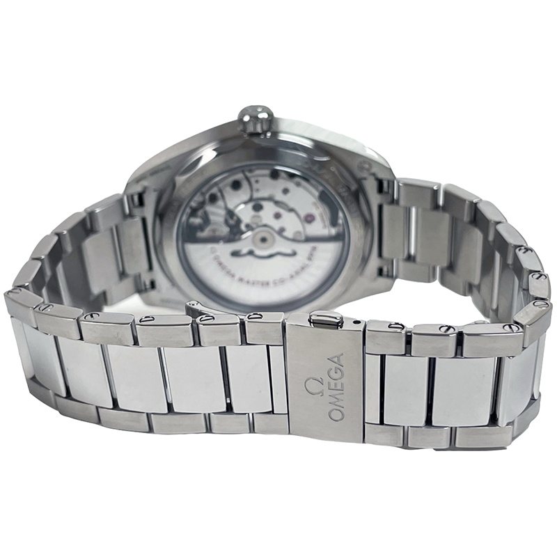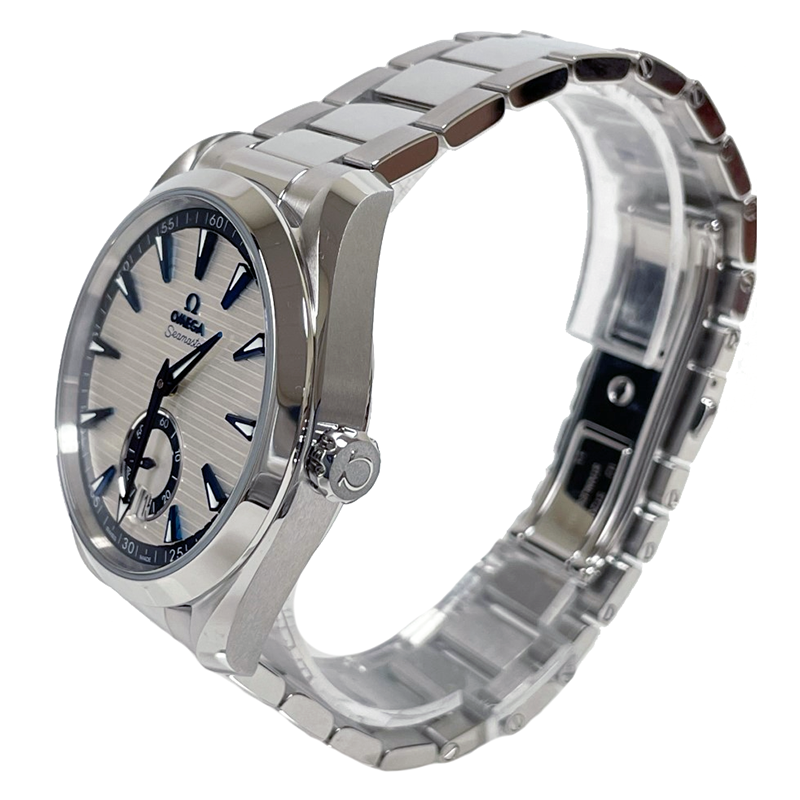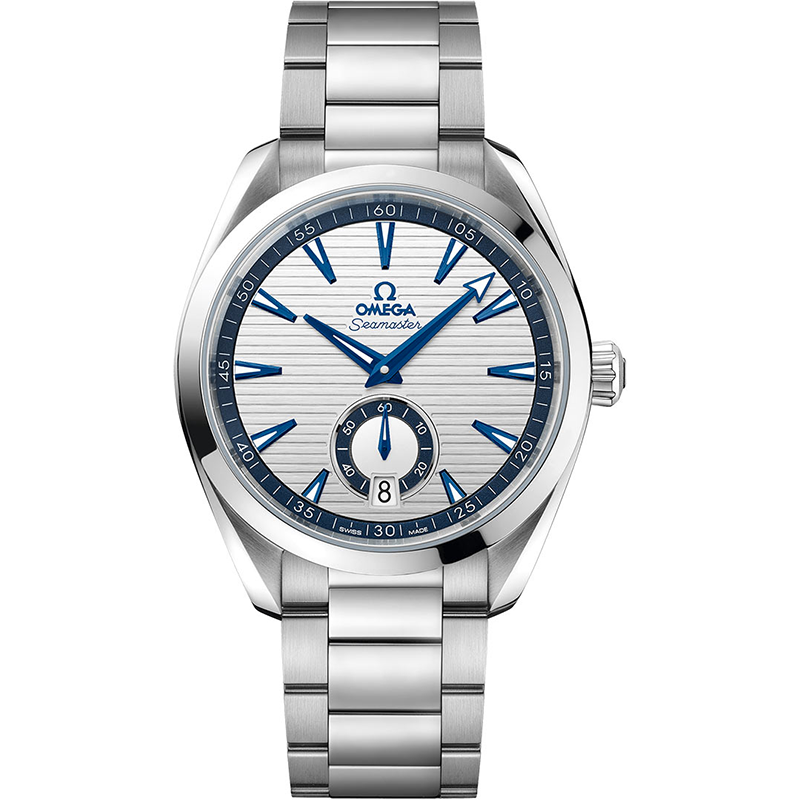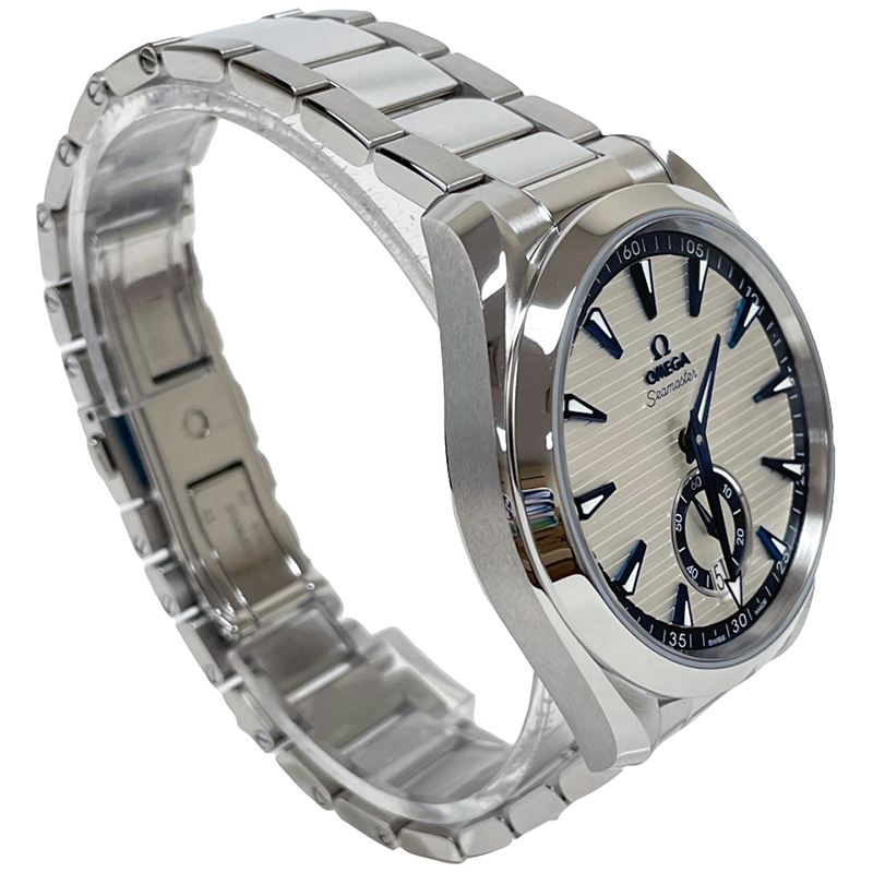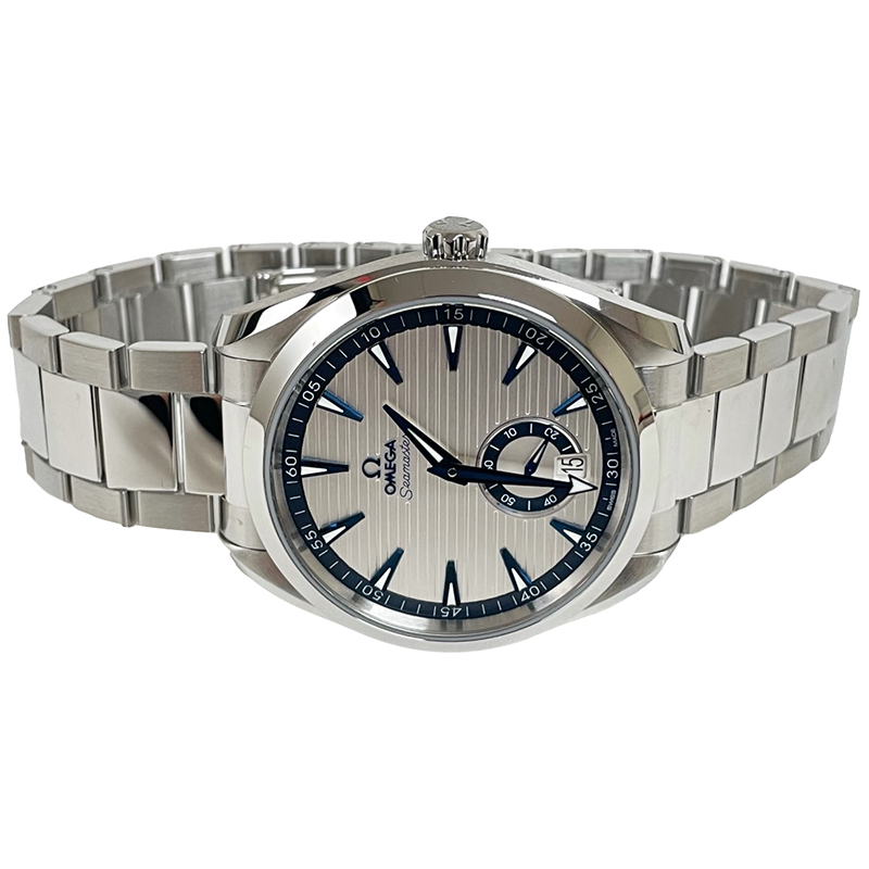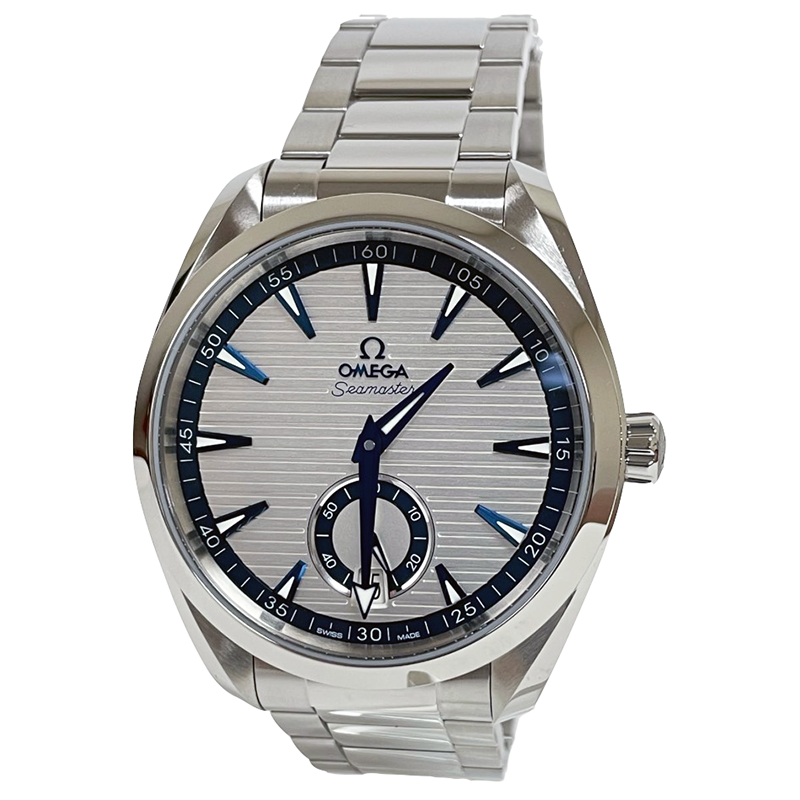 Omega 220.10.41.21.02.004 Aqua Terra 150M Small Seconds Men's Watch. This exquisite watch features a brushed and polished stainless steel case and bezel, complemented by a silver main dial with a horizontal linear teak pattern and blue dial rims. The blued faceted hands and applied index hour markers, both filled with luminous material, enhance visibility, while fine printed minutes and seconds tracks offer precision. A small seconds sub-dial and a date window, both positioned at 6 o'clock, add functionality. Powered by the Omega caliber 8916, which beats at 25,200 vph and contains 38 jewels with a power reserve of approximately 60 hours, this timepiece is a Swiss Federal Institute of Metrology (METAS) certified Master-Chronometer, ensuring exceptional precision and magnetic resistance up to 15,000 gauss. It also features Omega's Si14 silicon balance spring and Co-Axial escapement, with the rotor and visible bridges beautifully finished in Geneva waves in arabesque.