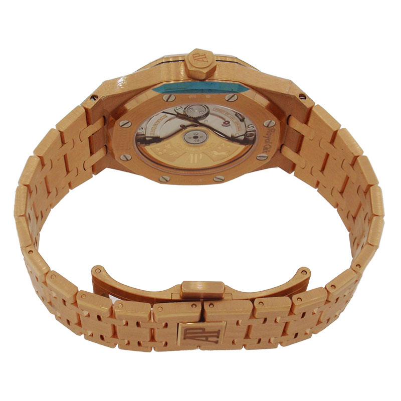 Audemars Piguet Royal Oak Silvered Dial Ladies Watch 15451OR.ZZ.1256OR.01. 18kt pink gold case with a 18kt pink gold bracelet. Fixed diamond set bezel. Silvered dial with pink gold-tone hands and index hour markers. Minute markers around the outer rim. Automatic movement. Scratch resistant sapphire crystal. Screw down crown. Skeleton case back. Case diameter: 37 mm. Case thickness: 9.8 mm. Octagonal case shape. Folding clasp. Water resistant at 50 meters / 165 feet. Functions: date, hour, minute, second.