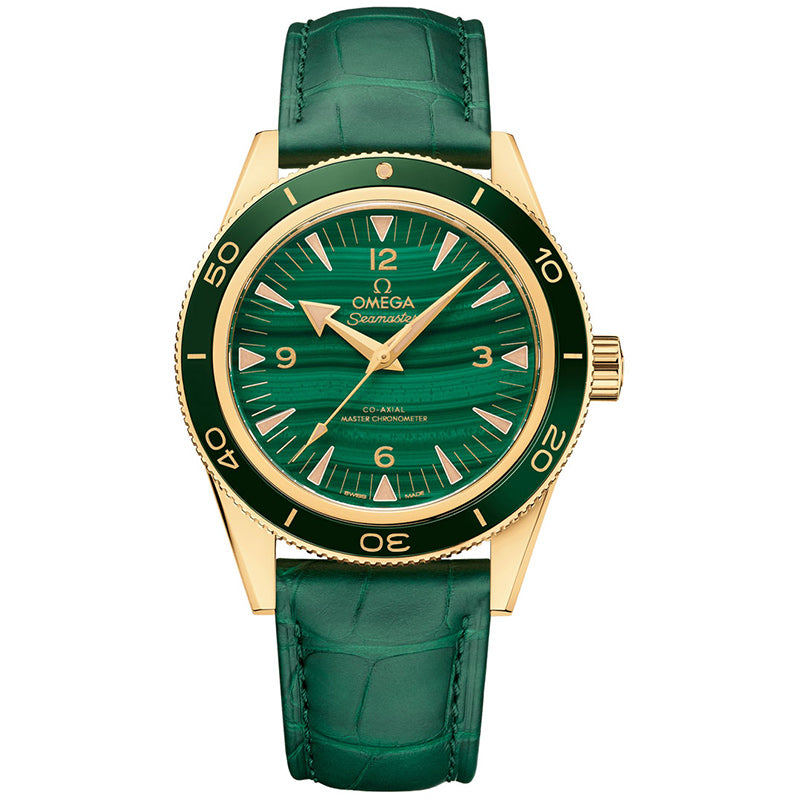 Omega 234.63.41.21.99.001 300 Seamaster Chronometer Men's Watch. The brushed and polished 18kt yellow gold case of this timepiece is complemented by a green ceramic bezel ring with a CeraGold diving scale and vintage colored luminous dot starting point. The natural green malachite dial is accented by polished 18kt yellow gold hands with vintage colored luminous fill. Recessed hour markers with vintage colored luminous fill and a fine printed minutes/seconds track complete the elegant design. The watch is powered by the Omega caliber 8913 movement, which beats at 25,200 vph and contains 38 jewels with an approximate power reserve of 60 hours. Featuring a solid 18kt Sedna (rose) gold rotor and balance bridge, the watch is METAS Certified Master-Chronometer, ensuring water resistance, precision, and magnetic resistance. Additional features include anti-magnetic resistance, Omegas Si14 silicon balance spring, and Co-Axial Escapement. The rotor and visible bridges are beautifully decorated with a unique arabesque wave design finish.