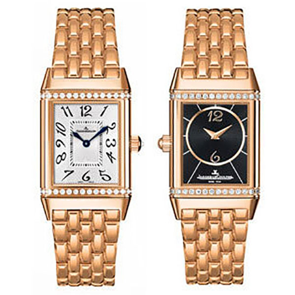 Jaeger LeCoultre Reverso Duetto 18k Yellow Gold Ladies Watch Q2562102. 18k yellow gold case with a 18k yellow gold bracelet. Fixed bezel. Silver/mother of pearl dial with blue-toned hands and Arabic hour markers. Minute markers around the outer rim. Hand wind movement. Power reserve 50 hours. Scratch resistant sapphire crystal. Pull / push crown. Case diameter: 37 mm x 23 mm. Rectangle case shape. Deployment clasp. Water resistant at 30 meters / 100 feet. Functions: hour, minute. Additional Info: 65 diamonds (0.72 carats),. Item Variations: Q2562102, 2562102, 256.21.02, Q256.21.02.