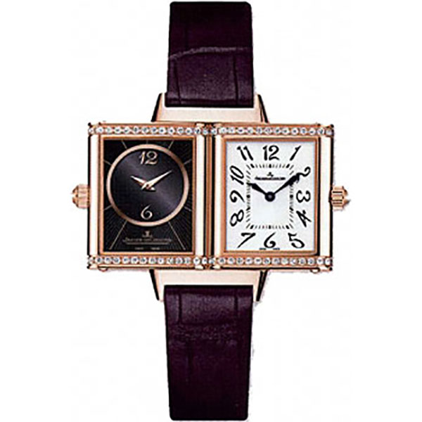 Jaeger LeCoultre Reverso Duetto Silver Dial 18kt Rose Gold Brown Leather Ladies Watch Q2562402. 18kt rose gold case with a brown leather strap. Fixed bezel set with diamonds bezel. Silver dial with blue-toned hands and Arabic hour markers. Minute markers around the outer rim. Hand wind movement. Caliber jlc 865 engine with about 50 hours power reserve. Scratch resistant sapphire crystal. Case diameter: 38 mm x 23 mm. Rectangle case shape. Deployant clasp. Water resistant at 30 meters / 100 feet. Functions: hour, minute. Additional Info: 65 diamonds (0.72 carats),. Luxury watch style. Watch label: Swiss Made. Item Variations: Q2562402, 2562402, 256.24.02, Q256.24.02.