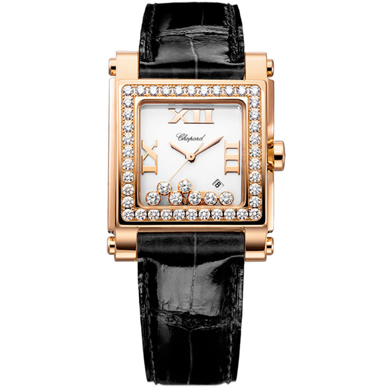 - Polished 18kt rose gold case with a black crocodile leather strap.
