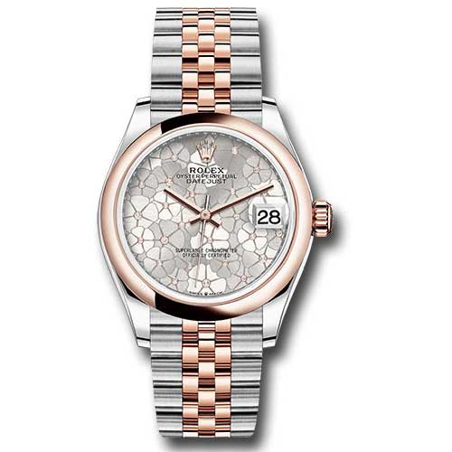 Rolex 278241 sflomdj 31mm Everose Rolesor case comprised of Oystersteel and Everose gold, screw-down back, screw-down crown with twinlock double waterproofness system, domed bezel, scratch-resistant sapphire crystal with cyclops lens over the date, silver floral motif dial set with 24 diamonds, Rolex calibre 2236 perpetual self-winding movement with centre hour, minute and seconds hands, instantaneous date with rapid setting, and stop-seconds for precise time setting, approximately 55 hours of power reserve, Jubilee bracelet with five-piece links, concealed folding Crownclasp buckle.