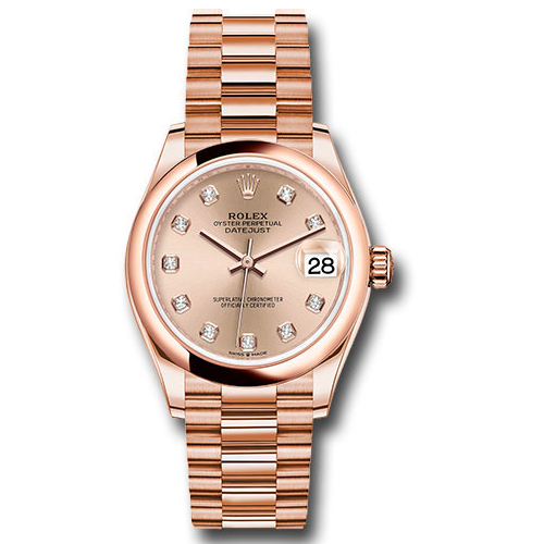 Rolex 278245 rsdp 31mm 18K Everose gold case, screw-down crown with twinlock double waterproofness system, domed bezel, scratch-resistant sapphire crystal with cyclops lens over the date, rosé dial, diamond hour markers, Rolex calibre 2236 automatic movement with center hour, minute and seconds hands, instantaneous date with rapid setting, and stop-seconds for precise time setting, approximately 55 hours of power reserve, 18K Everose gold President bracelet with semi-