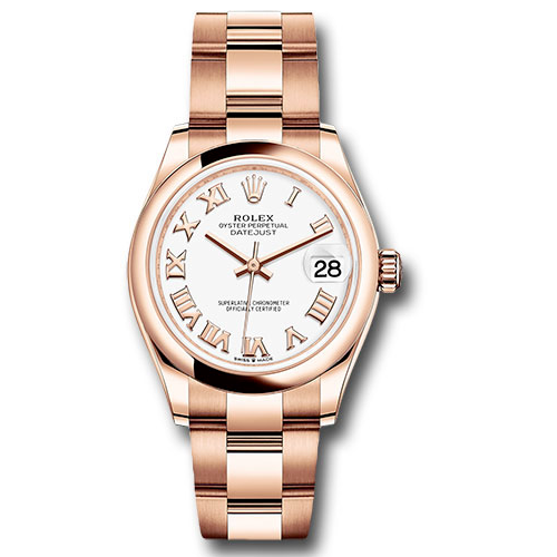 Rolex 278245 wro 31mm 18K Everose gold case, screw-down crown with twinlock double waterproofness system, domed bezel, scratch-resistant sapphire crystal with cyclops lens over the date, white dial, Roman numerals, Rolex calibre 2236 automatic movement with center hour, minute and seconds hands, instantaneous date with rapid setting, and stop-seconds for precise time setting, approximately 55 hours of power reserve, 18K Everose gold Oyster bracelet with flat three-piece links, concealed folding Crownclasp buckle.