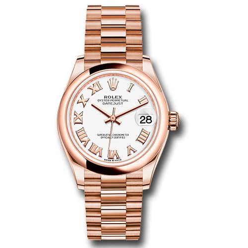 Rolex 278245 wrp 31mm 18K Everose gold case, screw-down crown with twinlock double waterproofness system, domed bezel, scratch-resistant sapphire crystal with cyclops lens over the date, white dial, Roman numerals, Rolex calibre 2236 automatic movement with center hour, minute and seconds hands, instantaneous date with rapid setting, and stop-seconds for precise time setting, approximately 55 hours of power reserve, 18K Everose gold President bracelet with semi-