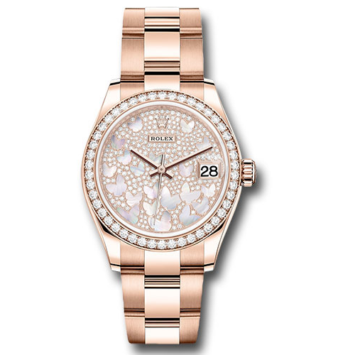 Rolex 278285RBR pmopbo 31mm 18K Everose gold case, screw-down crown with twinlock double waterproofness system, bezel set with 46 diamonds, scratch-resistant sapphire crystal with cyclops lens over the date, Diamond Paved Mother-of-Pearl Butterfly Dial, Rolex calibre 2236 automatic movement with center hour, minute and seconds hands, instantaneous date with rapid setting, and stop-seconds for precise time setting, approximately 55 hours of power reserve, 18K Everose gold Oyster bracelet with flat three-piece links, concealed folding Crownclasp buckle.