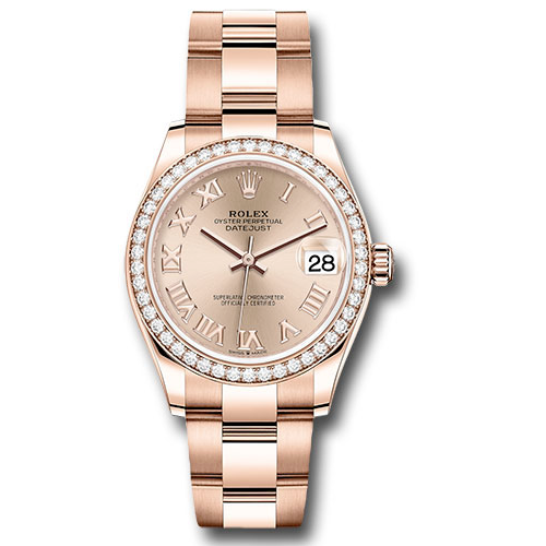 Rolex 278285RBR rsro 31mm 18K Everose gold case, screw-down crown with twinlock double waterproofness system, bezel set with 46 diamonds, scratch-resistant sapphire crystal with cyclops lens over the date, rose dial, Roman Numerals, Rolex calibre 2236 automatic movement with center hour, minute and seconds hands, instantaneous date with rapid setting, and stop-seconds for precise time setting, approximately 55 hours of power reserve, 18K Everose gold Oyster bracelet with flat three-piece links, concealed folding Crownclasp buckle.