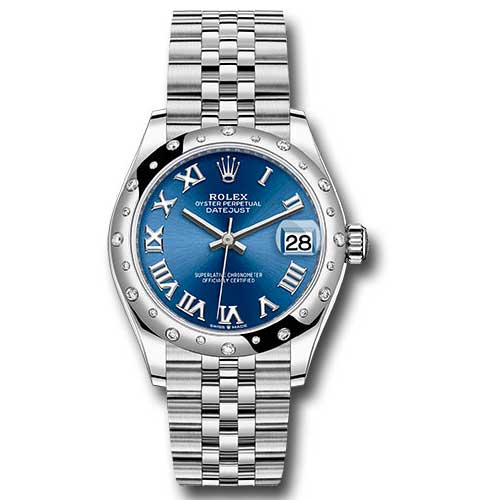 Rolex 278344RBR blrj 31mm white Rolesor case comprised of Oystersteel and 18K white gold, screw-down back, screw-down crown with twinlock double waterproofness system, 18K white gold domed bezel set with 24 diamonds, scratch-resistant sapphire crystal with cyclops lens over the date, blue dial, Roman numerals, Rolex calibre 2236 perpetual self-winding movement with date at 3 o'clock, approximately 55 hours of power reserve, Oystersteel Jubilee bracelet with five-piece links, concealed folding Crownclasp buckle.