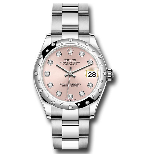 Rolex 278344RBR pdo 31mm white Rolesor case comprised of Oystersteel and 18K white gold, screw-down back, screw-down crown with twinlock double waterproofness system, 18K white gold domed bezel set with 24 diamonds, scratch-resistant sapphire crystal with cyclops lens over the date, pink dial, diamond hour markers, Rolex calibre 2236 perpetual self-winding movement with date at 3 o'clock, approximately 55 hours of power reserve, Oystersteel Oyster bracelet with flat three-piece links, concealed folding Oysterclasp buckle.