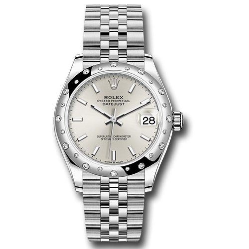 Rolex 278344RBR sij 31mm white Rolesor case comprised of Oystersteel and 18K white gold, screw-down back, screw-down crown with twinlock double waterproofness system, 18K white gold domed bezel set with 24 diamonds, scratch-resistant sapphire crystal with cyclops lens over the date, silver dial, index hour markers, Rolex calibre 2236 perpetual self-winding movement with date at 3 o'clock, approximately 55 hours of power reserve, Oystersteel Jubilee bracelet with five-piece links, concealed folding Crownclasp buckle.