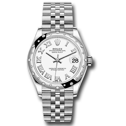 Rolex 278344RBR wrj 31mm white Rolesor case comprised of Oystersteel and 18K white gold, screw-down back, screw-down crown with twinlock double waterproofness system, 18K white gold domed bezel set with 24 diamonds, scratch-resistant sapphire crystal with cyclops lens over the date, white dial, Roman numerals, Rolex calibre 2236 perpetual self-winding movement with date at 3 o'clock, approximately 55 hours of power reserve, Oystersteel Jubilee bracelet with five-piece links, concealed folding Crownclasp buckle.