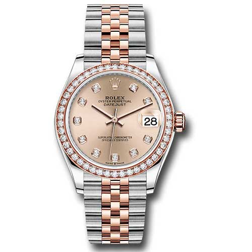 Rolex 278381RBR rodj 31mm Everose Rolesor case comprised of Oystersteel and 18K Everose gold, screw-down back, screw-down crown with twinlock double waterproofness system, 18K Everose gold bezel set with 46 diamonds, scratch-resistant sapphire crystal with cyclops lens over the date, rose dial, diamond hour markers, Rolex calibre 2236 perpetual self-winding movement with date at 3 o'clock, approximately 55 hours of power reserve, Everose Rolesor Jubilee bracelet with semi-circular three-piece links, concealed folding Crownclasp buckle.