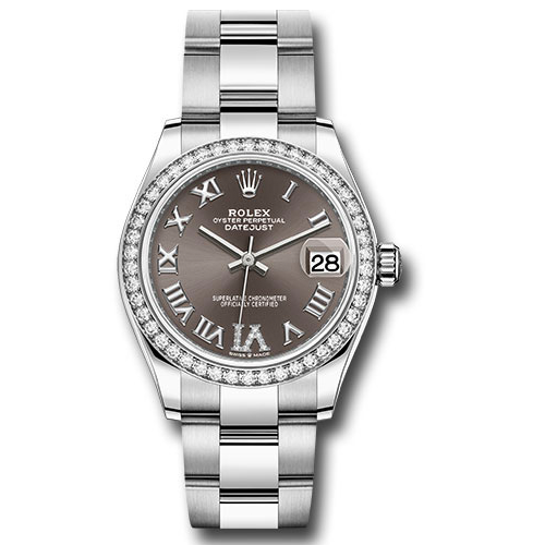 Rolex 278384RBR dkgdr6o 31mm white Rolesor case comprised of Oystersteel and 18K white gold, screw-down back, screw-down crown with twinlock double waterproofness system, 18K white gold bezel set with 46 diamonds, scratch-resistant sapphire crystal with cyclops lens over the date, dark gray dial, Roman numerals with diamond set 6, Rolex calibre 2236 perpetual self-winding movement with date at 3 o'clock, approximately 55 hours of power reserve, Oystersteel Oyster bracelet with five-piece links, concealed folding Crownclasp buckle.
