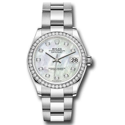 Rolex 278384RBR mdo 31mm white Rolesor case comprised of Oystersteel and 18K white gold, screw-down back, screw-down crown with twinlock double waterproofness system, 18K white gold bezel set with 46 diamonds, scratch-resistant sapphire crystal with cyclops lens over the date, mother-of-pearl dial, diamond hour markers, Rolex calibre 2236 perpetual self-winding movement with date at 3 o'clock, approximately 55 hours of power reserve, Oystersteel Oyster bracelet with five-piece links, concealed folding Crownclasp buckle.