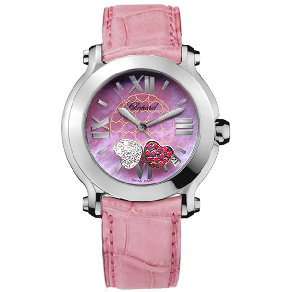Chopard 278475-3004 Happy Sport Ladies Watch. Stainless Steel case with pink crocodile leather strap. Pink mother-of-pearl dial with heart printed design in the center and Roman numerals and index hour markers. Two floating hearts (13 diamonds, 13 rubies). Displays date between the 4 and 5 o'clock position. Crown set with ruby sapphire.