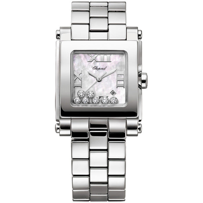 - Mother-of-pearl dial with applied steel Roman numerals and 7 floating diamonds.