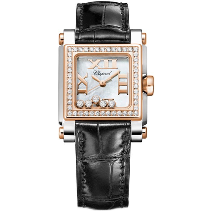 - Mother-of-pearl dial with applied gold-toned Roman numerals and 5 floating diamonds.