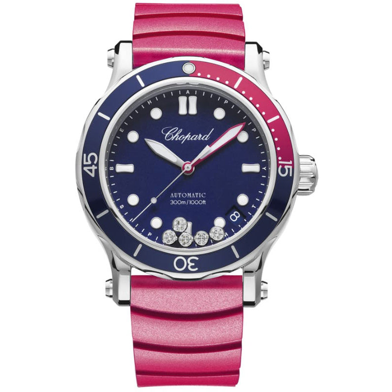 Chopard Happy Ocean 278587-3002 Ladies Watch. This stunning watch boasts a stainless steel case with a beautiful blue dial that perfectly complements the elegance of the timepiece. The dial is adorned with five floating diamonds that add a touch of luxury and sophistication to the design. The crown is also set with a striking blue Sapphire, adding a pop of color and a touch of glamour to this exquisite accessory.