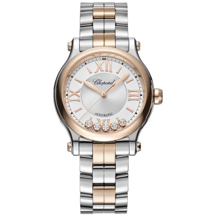 Chopard 278608-6002 Happy Sport Automatic 33mm Ladies watch. Crafted in an exquisite blend of 18kt rose gold and stainless steel, the case and bracelet of this Chopard watch radiate a harmonious fusion of luxury and durability. The polished rose gold crown, embellished with a single sapphire cabochon, adds a touch of sophistication to the timepiece. The silver textured dial provides an elegant backdrop for the watch's design, while the five floating/spinning diamonds, totaling around 0.25 carats, bring a captivating shimmer to the wrist. Driving this exceptional watch is the Chopard in-house caliber 09.01-C, a precision movement that beats at 25,200 vph, features 27 jewels, and offers an approximate power reserve of 42 hours. This watch is a perfect union of style, craftsmanship, and performance, making it a standout accessory for any discerning individual.