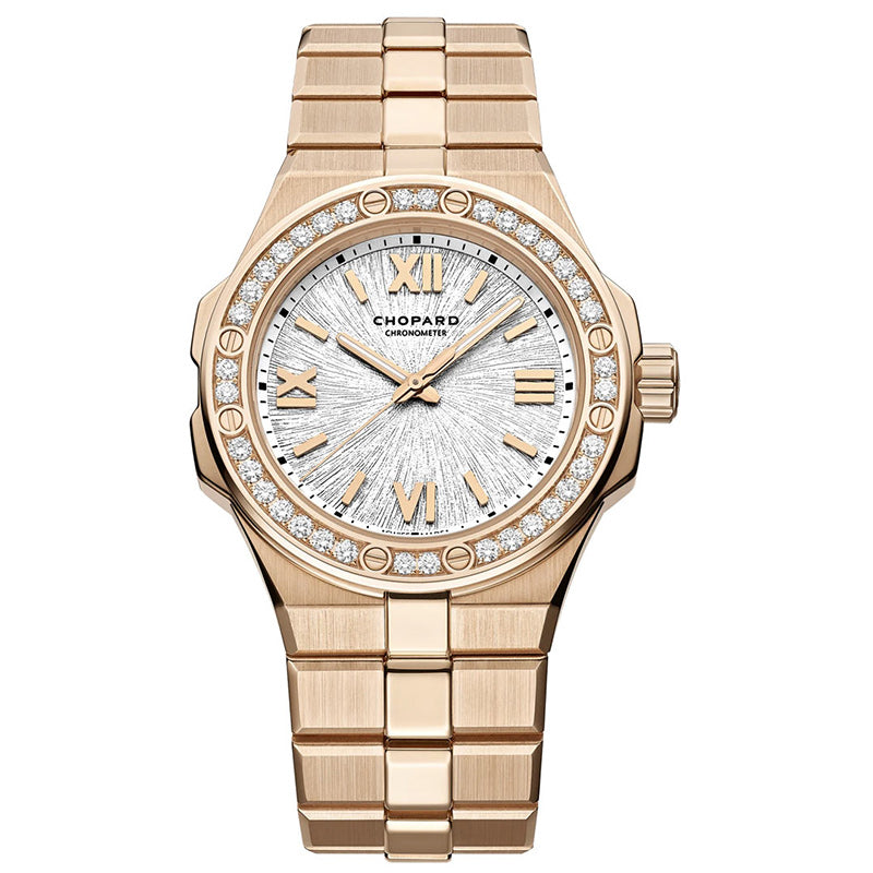 Chopard 295384-5001 Ladies Alpine Eagle 33mm Watch. Exuding luxury and sophistication, this exquisite timepiece boasts an 18kt rose gold case and bracelet adorned with a diamond set bezel featuring approximately 0.57 total carat weight. The Vals gray galvanized dial is accented with applied gilded Roman numeral and index hour markers, along with gold hands complete with luminous fill for enhanced visibility. Equipped with the Chopard Caliber 09.01-C, this watch operates at 25,200 vph and provides an approximate power reserve of 42 hours, making it a standout accessory that combines elegance with precision engineering.