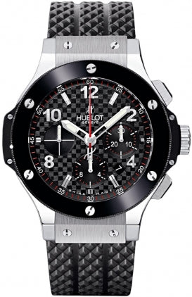 Hublot Big Bang Steel Ceramic Mens Watch 301.SB.131.RX. Stainless steel case with a black rubber strap. Fixed black ceramic bezel. Black carbon fiber pattern dial with luminous hands and alternating Arabic numeral and index hour markers. Minute markers around the outer rim. Chronograph - three sub-dials displaying: 60 second, 30 minute and 12 hour. Automatic movement with a 42-hour power reserve. Scratch resistant sapphire crystal. Pull / push crown. Transparent case back. Case diameter: 44 mm. Case thickness: 14.5 mm. Round case shape. Band width: 25 mm. Band length: 8 inches. Fold over clasp with a push button release. Water resistant at 100 meters / 330 feet. Functions: hours, minutes, seconds, calendar, chronograph. Sport watch. Item Variations: 301.SB.131.RX, 301-SB-131-RX, 301/SB/131/RX, 301SB131RX.