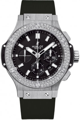 Hublot Big Bang 44mm Mens Watch 301.SX.1170.RX.1104. Stainless steel case with a black rubber strap. Fixed, set with diamonds bezel. Black dial with silver-tone hands and index hour markers. Minute markers around the outer rim. Chronograph - sub-dials displaying: three - 60 second, 30 minute and 12 hour. Automatic movement. Hub 4100 engine. Scratch resistant sapphire crystal. Case diameter: 44 mm. Round case shape. Deployment with push button clasp. Water resistant at 100 meters / 330 feet. Functions: date, hour, minute, second, chronograph. Additional Info: bezel set with 114 diamonds (1.70 carats). Luxury watch. Item Variations: 301 SX 1170 RX 1104, 301-SX-1170-RX-1104, 301/SX/1170/RX/1104, 301SX1170RX1104.