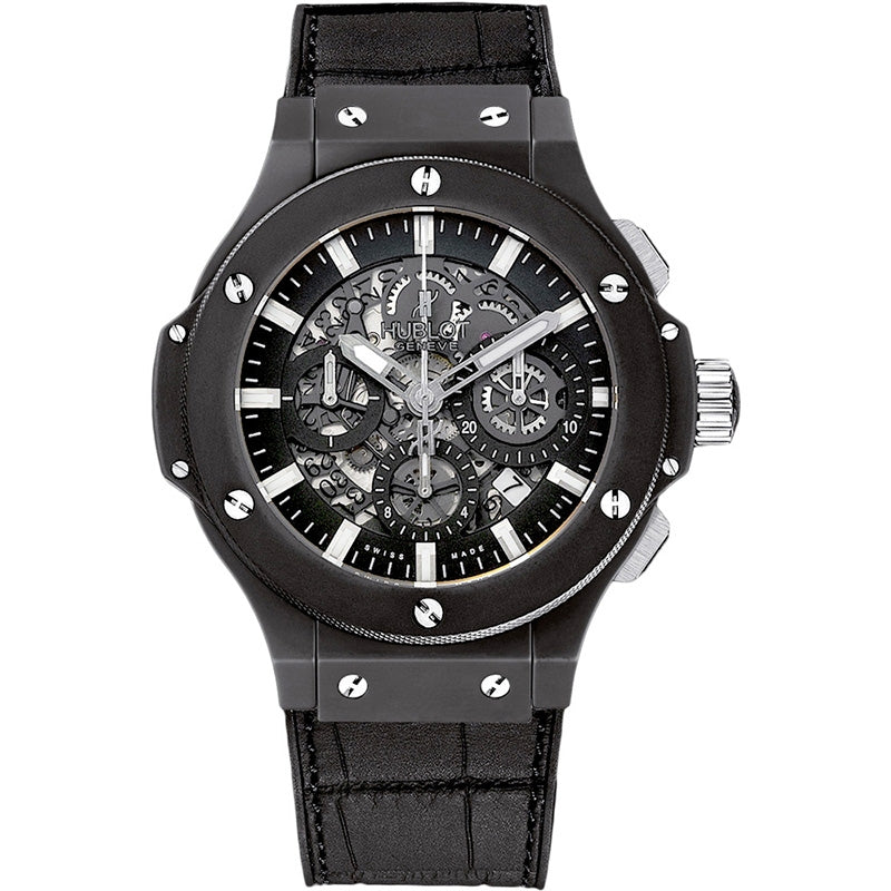 Hublot Big Bang Aero Black Magic Automatic Men's Watch 311.CI.1170.GR. Ceramic case with a alligator & rubber black strap. Fixed bezel. Black dial with luminous hands and index hour markers. Minutes markers appear around the outer rim. Chronograph - sub-dials displaying: three: 12 hours, 30 minutes, small seconds. Automatic movement. Scratch resistant sapphire crystal. Solid case back. Case diameter: 44mm. Round case shape. Deployment clasp. Water resistant at 100meters /330feet. Functions: hours, minutes, seconds, small seconds, chronograph and date.