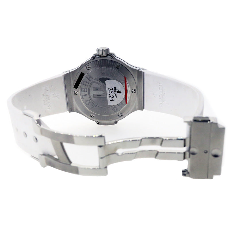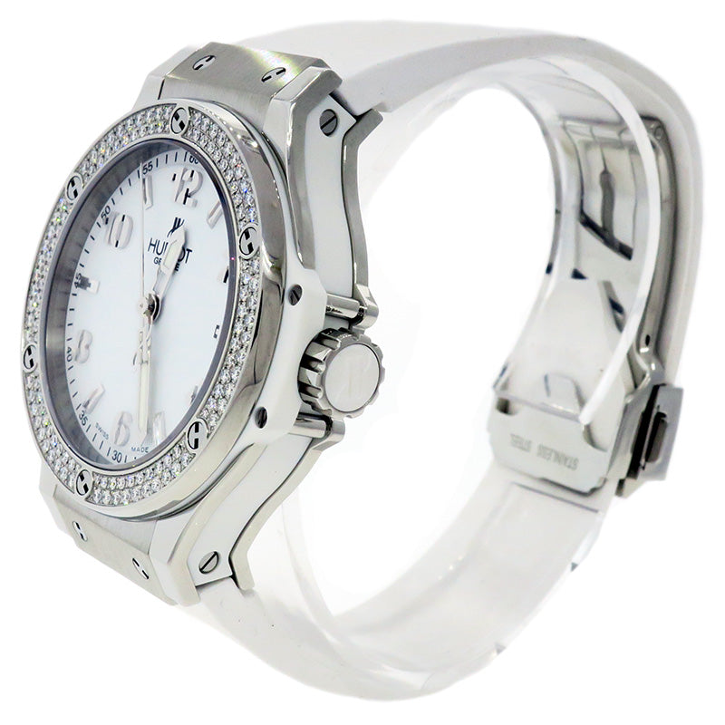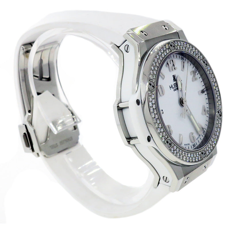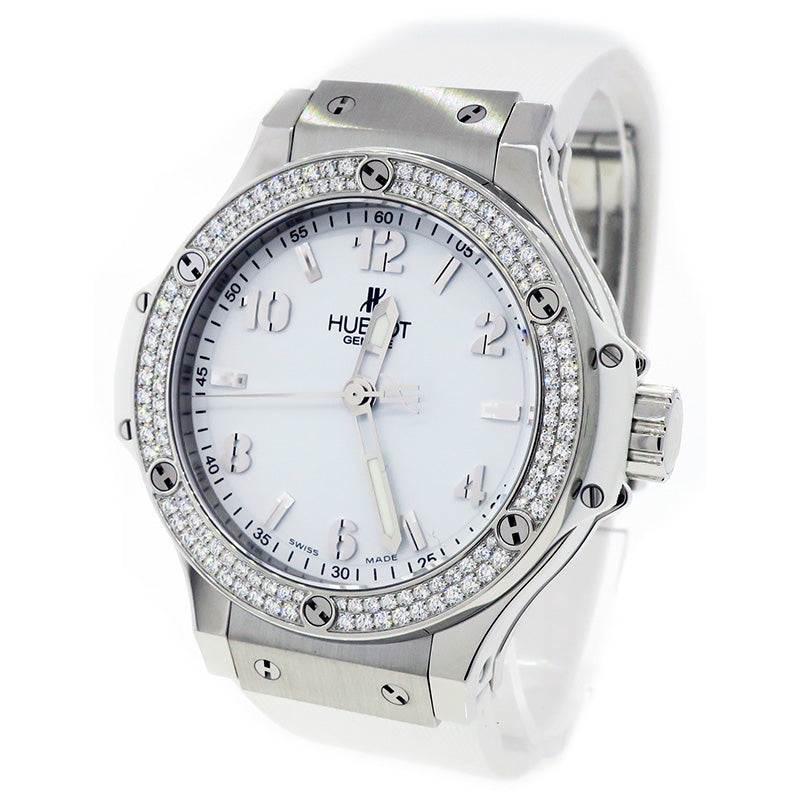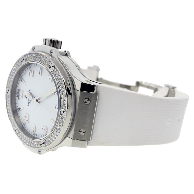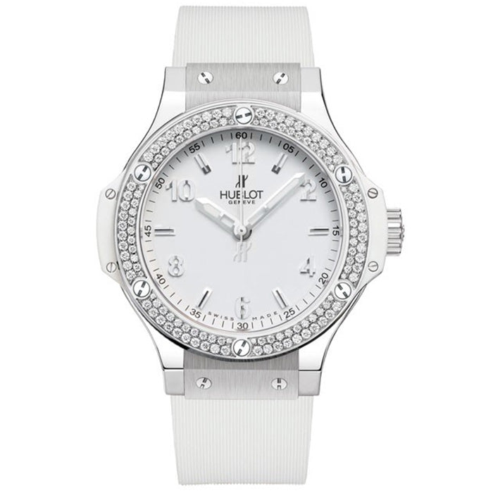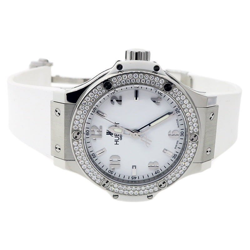 Hublot Big Bang White Dial Diamond Bezel White Rubber Unisex Watch 361.SE.2010.RW.1104. Stainless steel case with a white rubber strap. Fixed stainless steel bezel set with diamonds. White dial with silver-tone hands and alternating index and Arabic numeral hour markers. Minute markers around the outer rim. Quartz movement. Scratch resistant sapphire crystal. Textured steel crown. Solid case back. Case diameter: 38 mm. Case thickness: 12 mm. Round case shape. Deployment clasp. Water resistant at 100 meters / 330 feet. Functions: hours, minutes, seconds. Luxury watch.