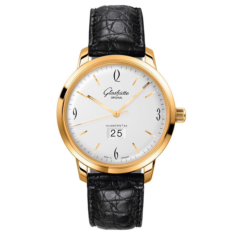 Distinctive retro-style Arabic numerals at 12, 3, 6, and 9 o’clock, along with applied index markers, add a touch of timeless sophistication. Powering the watch is the finely finished Glashütte Caliber 39-47, showcasing traditional watchmaking artistry with striped ribbing, hand-engraved detailing, and beveled edges.