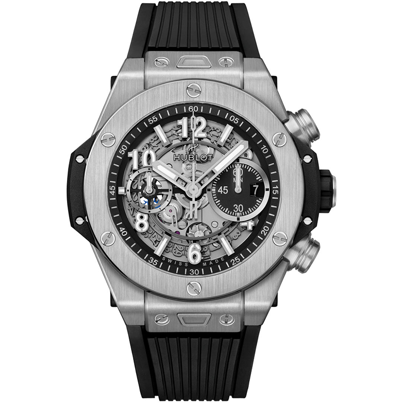 Hublot 421.nx.1170.rx Big Bang UNICO 44mm Men's Watch. Brushed titanium case with polished finished beveled corners. Brushed & polished titanium bezel, secured by 6 H style titanium screws. Case sides & bezel base black composite resin inserts. Skeleton dial. The hour & minute hands with luminous filled tips. Applied applique style index & numeral hour markers with luminous fill. Black dial flange with minute/seconds track. Date window at 3 o'clock.