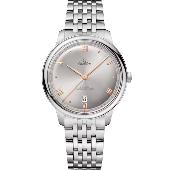 Omega 434.10.40.20.06.001 De Ville Prestige Co-Axial Master Chronometer 40mm Men's Watch. Featuring a polished stainless steel case and a domed rhodium-grey dial with a fine sunray finish, this watch is both elegant and durable. The polished rose gold toned hands and applied hour markers add a touch of luxury, while the printed minutes/seconds track and date window at 6 o'clock provide functionality. The Omega caliber 8800 movement beats at 25,200 vph and is certified as a Master-Chronometer by METAS, ensuring water resistance, precision, and anti-magnetic properties up to 15,000 gauss. With a power reserve of approximately 55 hours, this watch also boasts Omegas free-sprung balance, Si14 silicon balance spring, and Co-Axial Escapement, making it a standout timepiece with both style and substance.