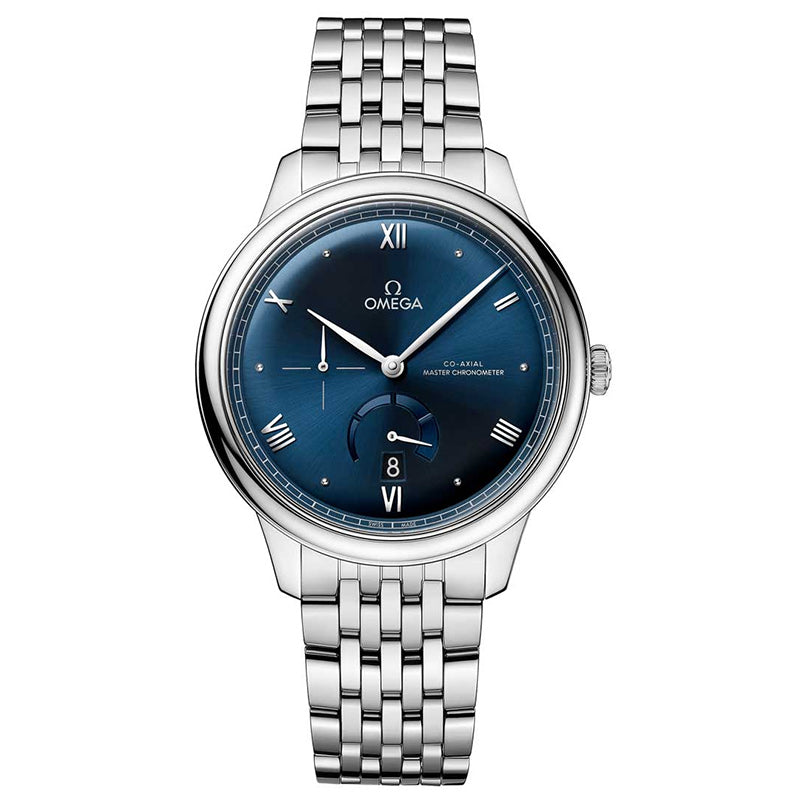 Omega 434.10.41.21.03.002 De Ville Prestige Co-Axial Master Power Reserve 41mm Men's Watch. The polished stainless steel case of this exquisite timepiece houses a domed blue dial with a fine crystal finish, beautifully complemented by polished rose gold toned hands and applied hour markers. A power reserve indicator is elegantly displayed at 6 o'clock, alongside a small seconds sub-dial at 9 o'clock and a convenient date window at 6 o'clock. Driving this watch is the Omega caliber 8810 movement, operating at 25,200 vph with 35 jewels and an approximate power reserve of 55 hours. Certified as a Master-Chronometer by METAS, this watch is anti-magnetic, resistant to magnetic fields greater than 15,000 gauss, and features Omegas free-sprung balance, a Si14 silicon balance spring, and Co-Axial Escapement. The rotor and visible bridges are adorned with a unique arabesque wave design finish, adding a touch of elegance to this exceptional timepiece.