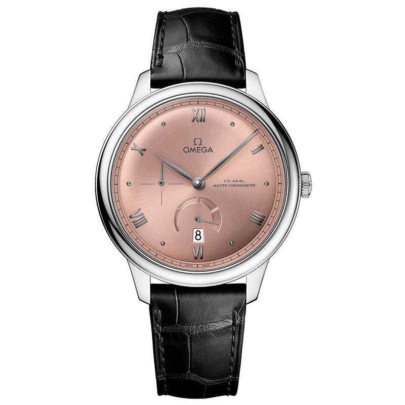 Omega 434.13.41.21.10.001 De Ville Prestige Co-Axial Master Power Reserve 41mm Men's Watch. The sleek polished stainless steel case of this watch encases a striking domed salmon-colored dial with a fine sunray finish, enhanced by polished hands and applied hour markers. A power reserve indicator is elegantly positioned at 6 o'clock, accompanied by a small seconds sub-dial at 9 o'clock and a convenient date window at 6 o'clock. The timepiece is powered by the Omega caliber 8810 movement, which beats at 25,200 vph and boasts 35 jewels, providing an approximate power reserve of 55 hours. Certified as a Master-Chronometer by METAS, this watch is resistant to magnetic fields greater than 15,000 gauss and features Omegas free-sprung balance, a Si14 silicon balance spring, and Co-Axial Escapement. The rotor and visible bridges are beautifully adorned with a unique arabesque wave design finish.