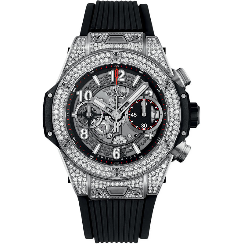 Hublot 441.nx.1170.rx.1704 Big Bang UNICO 42mm Men's Watch. Titanium case, satin/brushed finished with fine polished corners. Titanium bezel set with 126 diamonds (abt 1.1 carats), secured with 6 H style titanium screws. Pave case set with 170 diamonds about 0.8 carats. Black composite resin bezel lug & case band. Sapphire crystal transparent dial. Applied applique style Arabic numeral & index hour markers with luminous fill. Black dial flange with a minute/seconds track. Bold brushed finished hands with luminous fill. Date window at 3 o'clock.