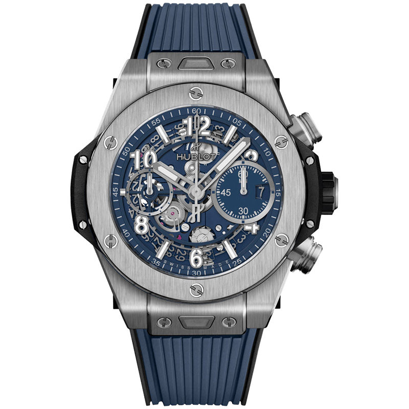 Hublot 441.nx.5171.rx Big Bang Unico 42mm Men's Watch. The titanium case of this watch features a satin/brushed finish with finely polished corners and is accompanied by a titanium bezel secured with 6 H style titanium screws. The black composite resin bezel lug and case band add a sleek contrast to the design, while the blue matte skeleton dial offers a unique and modern aesthetic. Applied applique style Arabic numerals and index hour markers with luminous fill provide easy readability, along with a blue dial flange featuring a minute/seconds track. The bold brushed finished hands with luminous fill ensure visibility, and a date window at 3 o'clock and a small seconds sub-dial at 9 o'clock add functionality. The watch includes a chronograph/stopwatch function with a column wheel mechanism, flyback function, large central seconds counter, and a 60-minute counter sub-dial at 3 o'clock. The straps can be easily swapped using a unique quick-release push-button system, and the timepiece is powered by the Hublot in-house manufacture Caliber UNICO HUB1280, featuring microblasted anthracite ruthenium plated mainplate and bridges, a tungsten rotor with microblasted, anthracite, and ruthenium treated finishes, and a power reserve of approximately 72 hours.