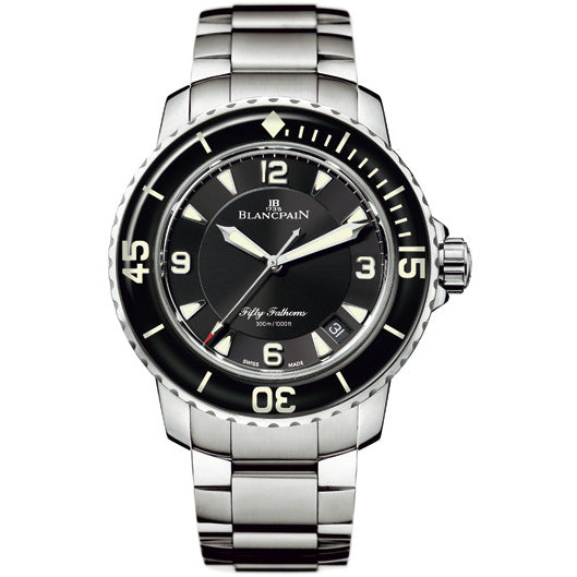 Blancpain Fifty Fathoms Black Dial Stainless Steel Automatic Men's Watch 5015-1130-71s. Stainless steel case with a stainless steel bracelet. Uni-directional rotating bezel. Black dial with luminous hands and index hour markers. Minute markers around the outer rim. Date display appears between the 4 and 5 o'clock position. Caliber 1315 automatic movement with about 120 hours of power reserve. Scratch resistant sapphire crystal. Case size: 45 mm. Case thickness: 15.50 mm. Round case shape. Band width: 23 mm. Deployment with push button clasp. Water resistant at 300 meters/ 1000 feet. Functions: hours, minutes, seconds, date. Luxury watch style. Watch label: Swiss Made. Item Variations: 5015 1130 71, 5015.1130.71, 5015113071.