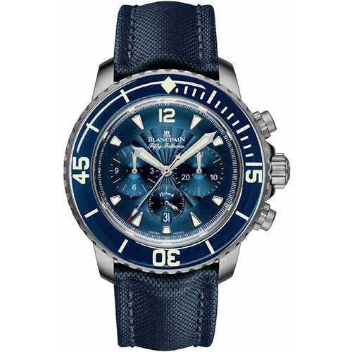 Blancpain Fifty Fathoms Chronograph Automatic Men's Watch 5085FB-1140-52B. Stainless steel case with a navy blue canvas bracelet. Uni-directional rotating bezel. Blue flinqué dial with silver-tone hands and index- Arabic at the 12 o' clock hour markers. Minute markers around the outer rim. Chronograph - sub-dials displaying: three- 60 seconds, 30 minutes, and 12 hours. Blancpain Calibre F185 automatic movement with about 40 hours of power reserve. Scratch resistant sapphire crystal. Screw down crown. Solid case back. Case size: 45 mm. Case thickness: 15.50 mm. Round case shape. Band width: 23 mm. Water resistant at 30 meters / 100 feet. Functions: flyback chronograph, date, hour, minute, second. Luxury watch style. Watch label: Swiss Made. Item Variations: 5085FB 1140 52B, 5085FB.1140.52B, 5085FB114052B