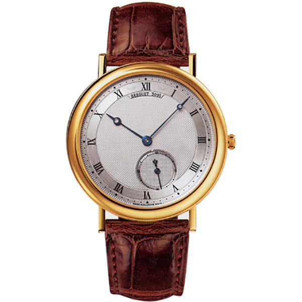 Breguet Classique Silver Dial Automatic 18kt Rose Gold Brown Leather Mens Watch 5140BA129W6. 18kt yellow gold case with a brown leather strap. Fixed 18kt yellow gold bezel. Silver dial with blue-toned hands and Roman numeral hour markers. Minute markers around the outer rim. Automatic movement. Scratch resistant sapphire crystal. Pull / push crown. Case diameter: 40 mm. Case thickness: 10.8 mm. Round case shape. Tang clasp. Water resistant at 30 meters / 100 feet. Functions: hour, minute, second.